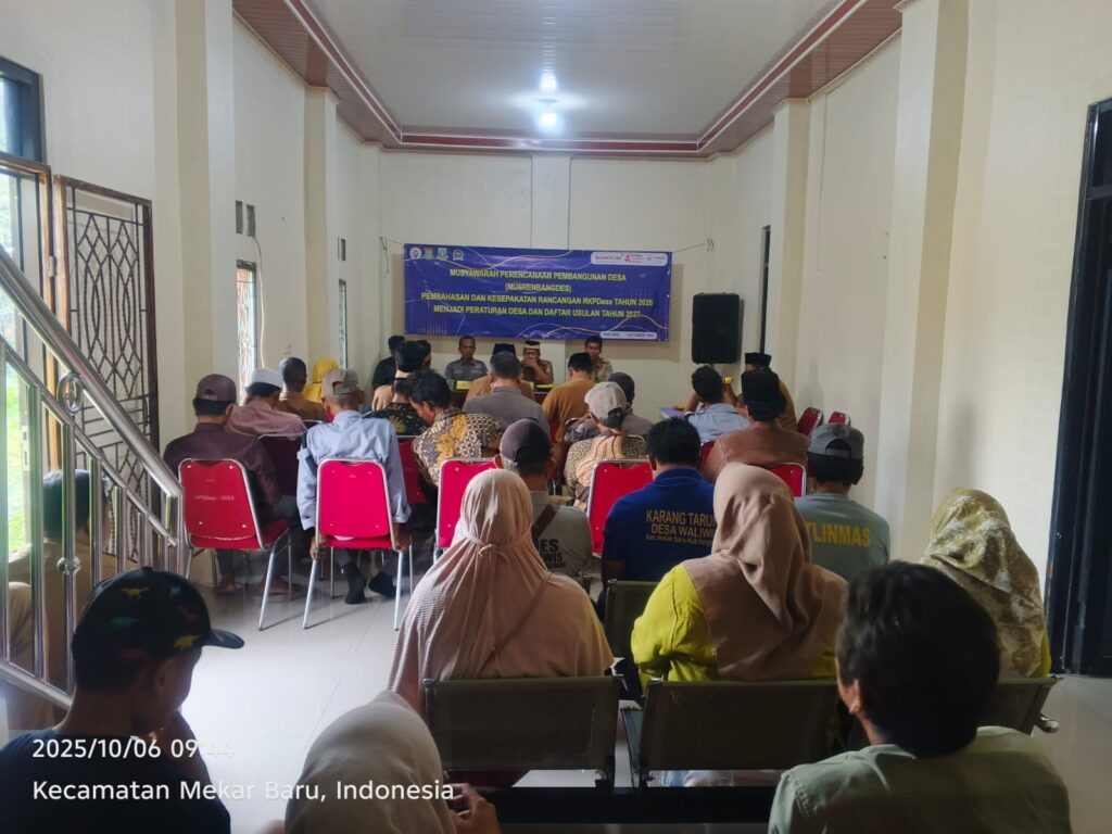 Musrenbangdes berlangsung di aula kantor desa dan dihadiri oleh berbagai unsur pemerintahan dan masyarakat. Hadir dalam kegiatan tersebut Muspika Kecamatan, KC Bina Mas, para ketua RT dan RW, kader Posyandu, PKK Desa, tokoh masyarakat, serta Badan Permusyawaratan Desa (BPD).