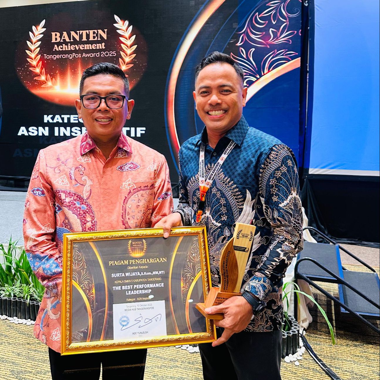 KABUPATEN TANGERANG — Prestasi membanggakan kembali diraih oleh Surta Wijaya, S.Kom., M.M., M.T.I. Ia berhasil meraih penghargaan The Best Performance Leadership pada ajang bergengsi Banten Achievement TangerangPos Award 2025.